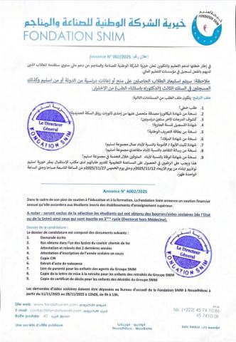 أعلنت خيرية الشركة الوطنية للصناعة والمناجم اسنيم، عن فتح باب الترشح للاستفادة من الدعم السنوي لطلاب التعليم العالي الحاصلين على الباكلوريا في إحدى المدن  المحاذية للسكة الحديدية، بما فيها انواذيبو وازويرات.